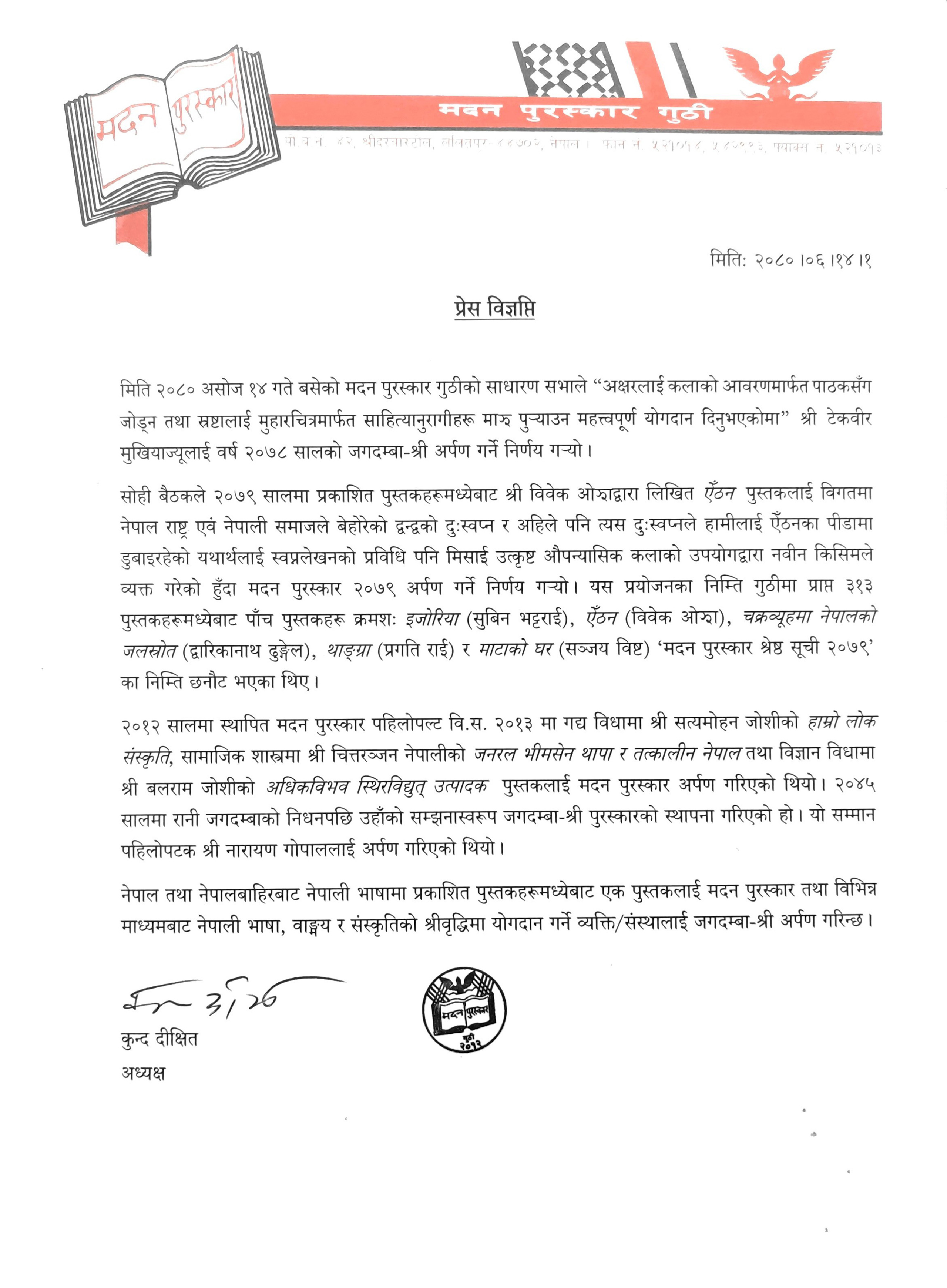 असोज १४ गते बसेको मदन पुरस्कार गुठीको साधारण सभाले विवेक ओझालाई मदन पुरस्कार र टेकवीर मुखियालाई वर्ष २०७८ सालको जगदम्बा(श्री पुरस्कार दिने निर्णय गरेको छ । बैठकले २०७९ सालमा प्रकाशित पुस्तकहरूमध्ये ऐँठन पुस्तकलाई मदन पुरस्कार प्रदान गर्ने निर्णय गरेको हो ।