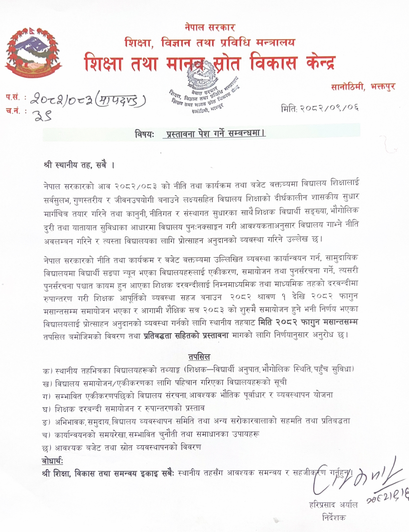 नेपाल सरकारले विद्यालय शिक्षालाई थप गुणस्तरीय, सर्वसुलभ र जीवनउपयोगी बनाउने उद्देश्यका साथ सामुदायिक विद्यालयहरूको भौतिक तथा प्रशासनिक पुनर्संरचनाको प्रक्रियालाई तीव्रता दिएको छ। शिक्षा तथा मानव स्रोत विकास केन्द्रले हालै एक परिपत्र जारी गर्दै देशभरका सबै स्थानीय तहहरूलाई विद्यालय समायोजन तथा एकीकरणका लागि विस्तृत प्रस्ताव पेश गर्न निर्देशन दिएको छ। यो कदम सरकारको आर्थिक वर्ष २०८२/०८३ को नीति तथा कार्यक्रम र बजेट वक्तव्यमा उल्लेखित विद्यालय शिक्षाको दीर्घकालीन शासकीय सुधार मार्गचित्रलाई कार्यान्वयन गर्ने योजना अन्तर्गत चालिएको हो।