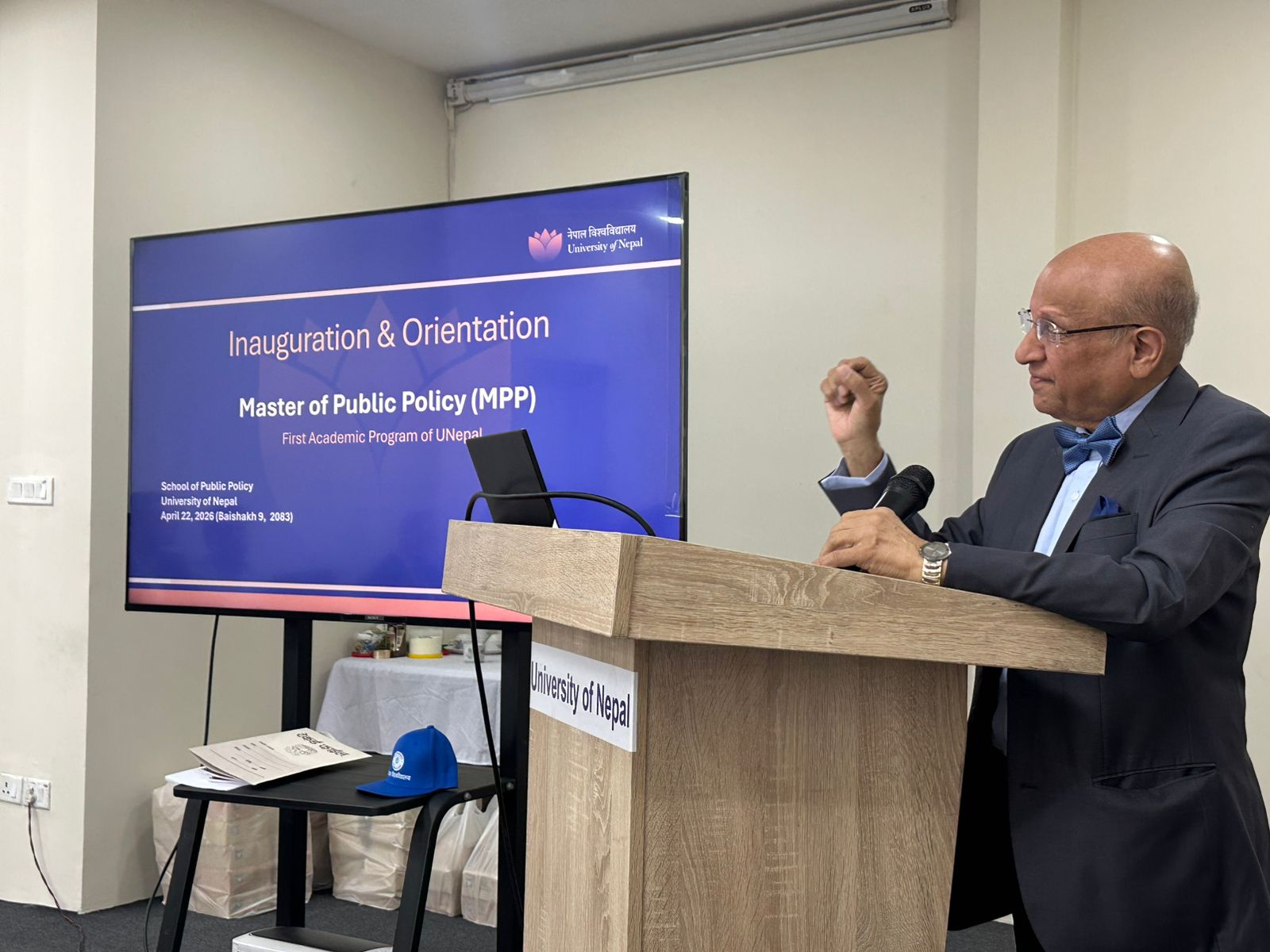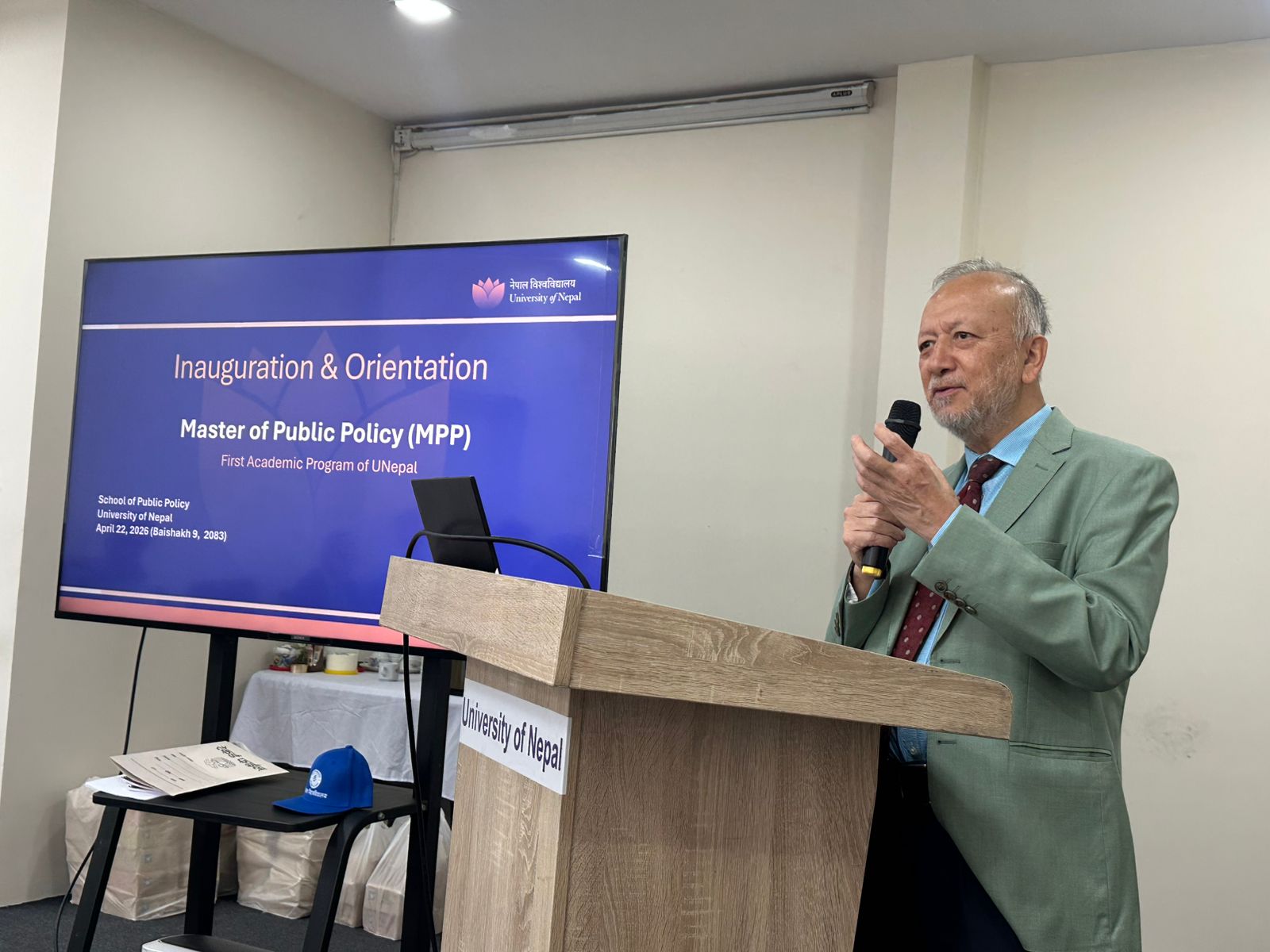 अवधारणागत चिन्तन-मनन तथा गुणस्तरीय उच्चशिक्षा क्षेत्रमा उल्लेखनीय योगदान पुर्याउने रणनीतिक सोचद्वारा निर्देशित सात वर्षको अनवरत प्रयासपछि स्थापित नेपाल विश्वविद्यालयले आफ्नो पहिलो प्राज्ञिक कार्यक्रमका रूपमा सार्वजनिक नीति विषयक स्नातकोत्तर तहमा भर्ना भएका विद्यार्थीहरूलाई स्वागत तथा अभिमुखीकरण गर्ने उद्देश्यले २०८३ साल वैशाख ९ गते आयोजना गरिएको उद्घाटन कार्यक्रम भव्यतापूर्वक सम्पन्न गरेको छ।