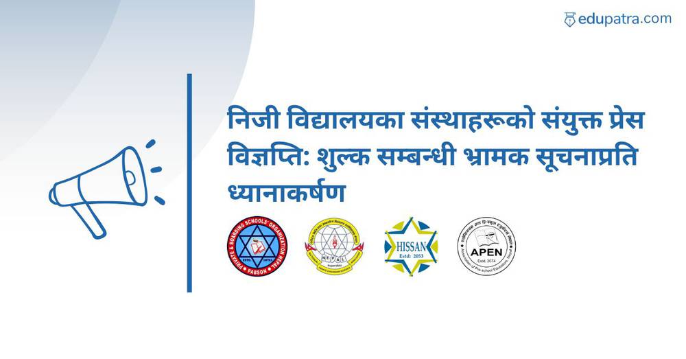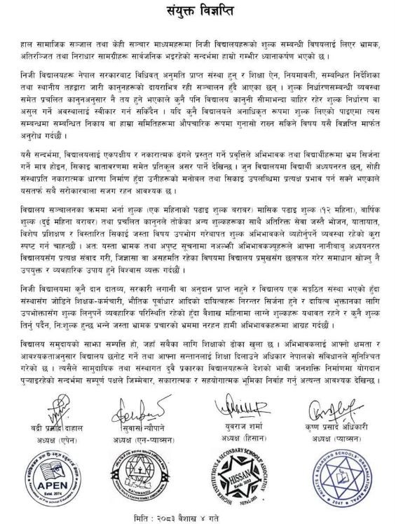 निजी विद्यालयसँग सम्बन्धित संस्थाहरू एपन (APEN), एन-प्याव्सन (NPABSAN), हिसान (HISSAN) र प्याब्सन (PABSON) ले शुल्क सम्बन्धी विषयमा सामाजिक सञ्जाल तथा केही सञ्चार माध्यममा फैलिएको भ्रामक, अतिरञ्जित तथा निराधार सूचनाप्रति ध्यानाकर्षण जनाउँदै संयुक्त प्रेस विज्ञप्ति जारी गरेका छन्।