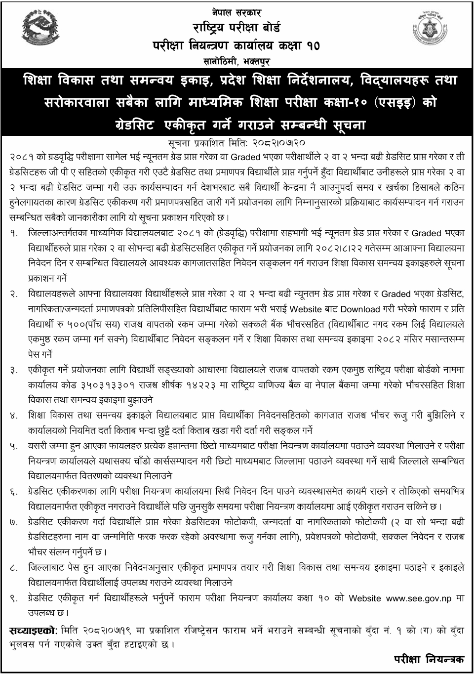 राष्ट्रिय परीक्षा बोर्ड अन्तर्गत परीक्षा नियन्त्रण कार्यालय (कक्षा–१०) ले माध्यमिक शिक्षा परीक्षा (एसईई) २०८१ को ग्रेडवृद्धि परीक्षामा सहभागी भई न्यूनतम ग्रेड प्राप्त गरेका वा Graded भएका विद्यार्थीका लागि ग्रेडसिट एकीकृत गरी प्रमाणपत्रसहित जारी गर्न सम्बन्धी सूचना सार्वजनिक गरेको छ।सूचना मिति २०८२/१०/७२० मा प्रकाशित गरिएको हो।