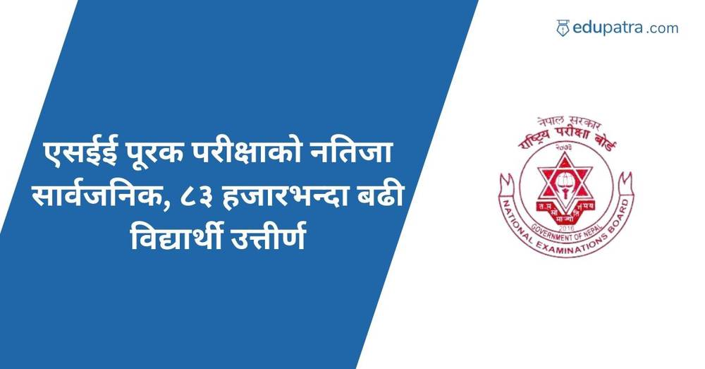 भक्तपुर — राष्ट्रिय परीक्षा बोर्डले आज (शनिबार) माध्यमिक शिक्षा परीक्षा (एसईई) पूरक परीक्षाको नतिजा सार्वजनिक गरेको छ। यस परीक्षामा ८३ हजार ५६४ परीक्षार्थी उत्तीर्ण (ग्रेडेड) भएका छन्। बोर्डका अध्यक्ष महाश्रम शर्माका अनुसार कुल १ लाख ४३ हजार २५७ विद्यार्थी सहभागी भएकामध्ये ५९ हजार ६९३ जना अनुत्तीर्ण (अवर्गीकृत) भएका छन्।