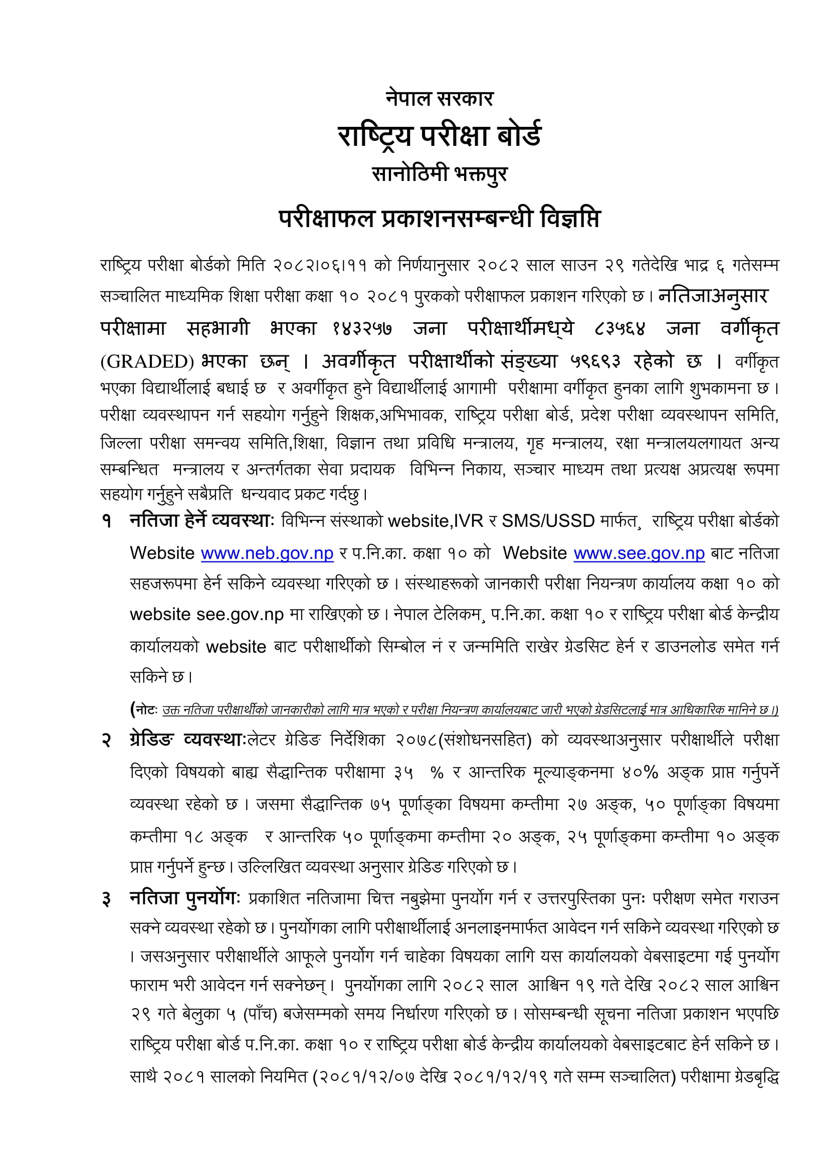 बोर्डले नतिजा हेर्नका लागि IVR / SMS - USSD सेवासँगै, see.edusanjal.com राष्ट्रिय परीक्षा बोर्डको आधिकारिक वेबसाइट www.neb.gov.np र कक्षा १० को पोर्टल www.see.gov.np प्रयोग गर्न सकिने जनाएको छ। साथै, www.see.gov.np मा परीक्षार्थीको सिम्बोल नम्बर र जन्ममिति राखेर ग्रेडसिट हेर्न तथा डाउनलोड गर्न सकिने व्यवस्था गरिएको छ।