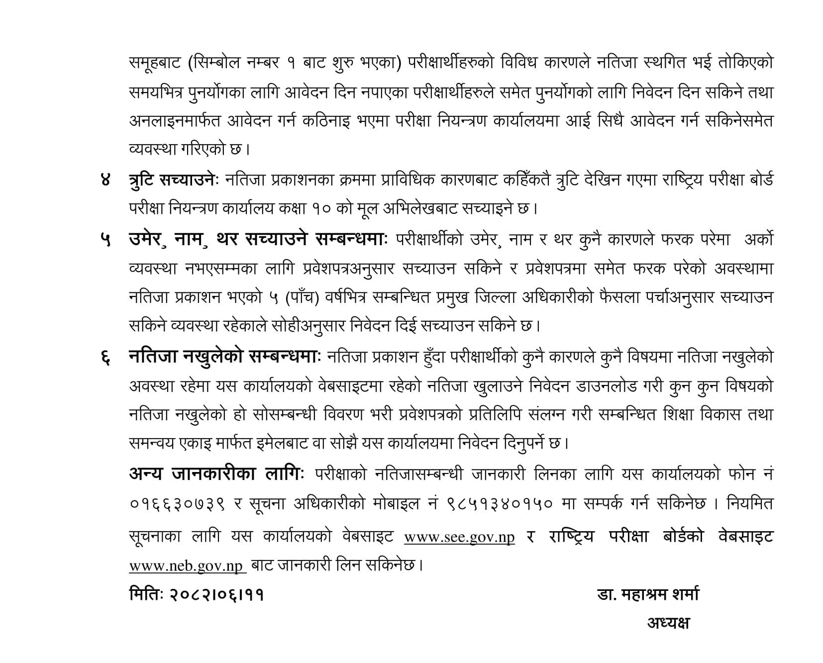 बोर्डले नतिजा प्रति चित्त नबुझेका विद्यार्थीलाई पुनर्योग (रिचेक) गर्न पाउने व्यवस्था गरेको छ। इच्छुक विद्यार्थीहरूले यही असोज १९ गतेदेखि २९ गते साँझ ५ बजेभित्र बोर्डको वेबसाइटमार्फत फाराम भरी आवेदन दिन सक्नेछन्।