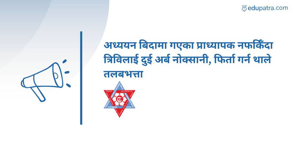 अध्ययन बिदामा गएका त्रिभुवन विश्वविद्यालयका प्राध्यापक नफर्किँदा रु दुई अर्ब बढीको नोक्सानी भएको छ । त्रिविको नियमअनुसार शिक्षक–कर्मचारीले पाँच वर्षसम्म अध्ययन बिदा पाउने प्रावधान छ ।